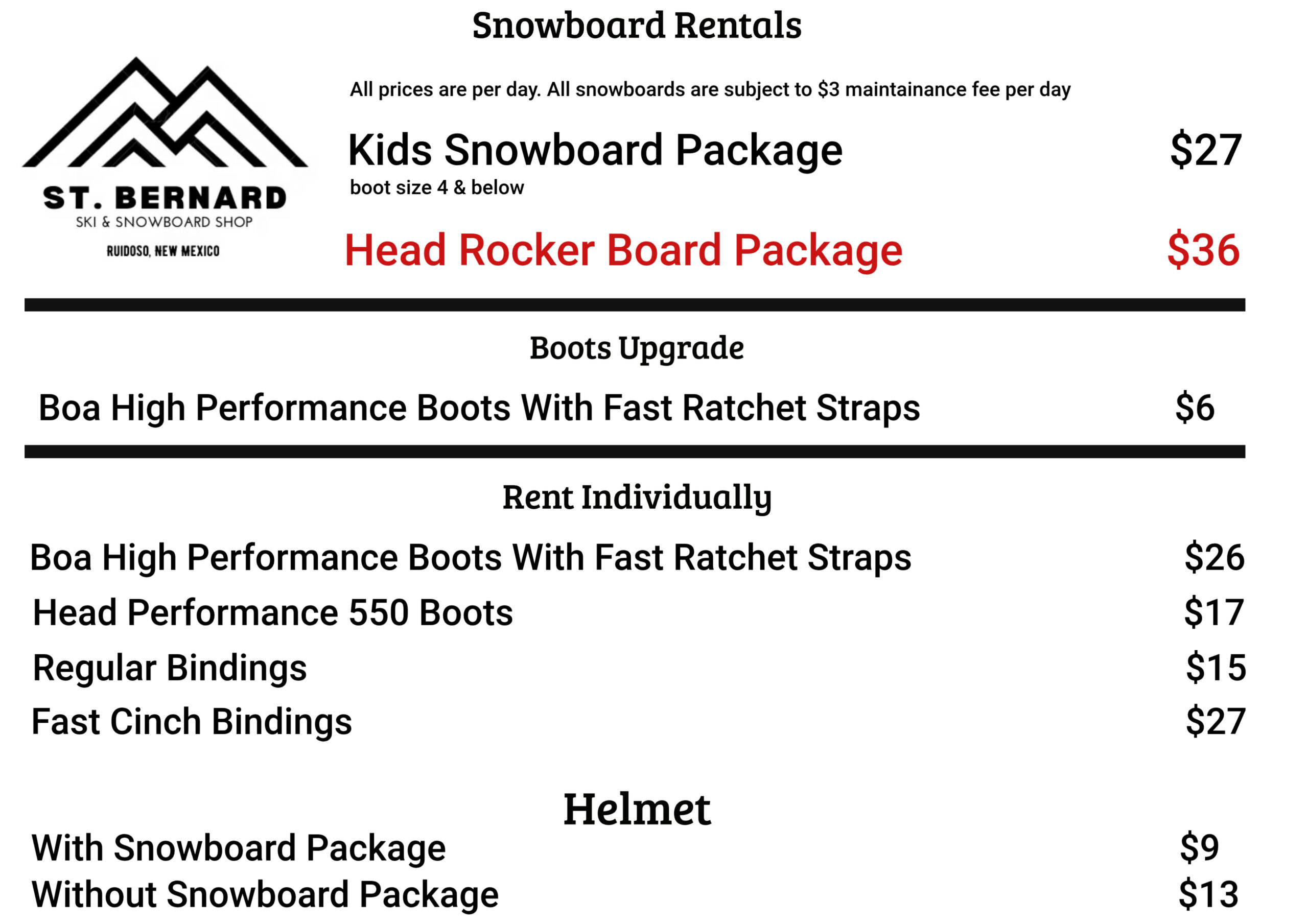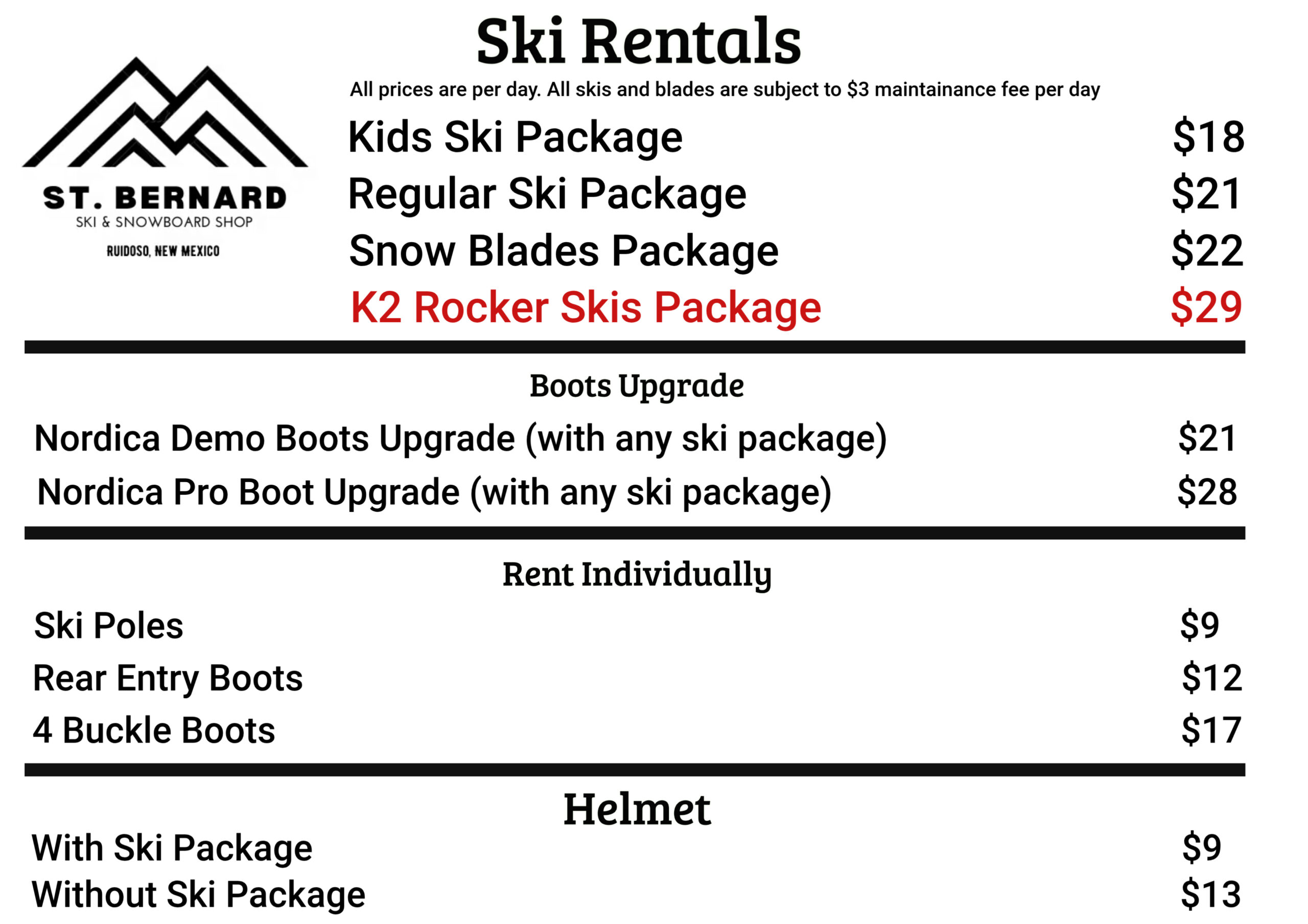 Most popular package is New Rocker ski and snowboard technology -Experienced ski techs on hand to assist you. We also have clothing and helmet rental. Forget something? Need something? Don’t worry! We have it all